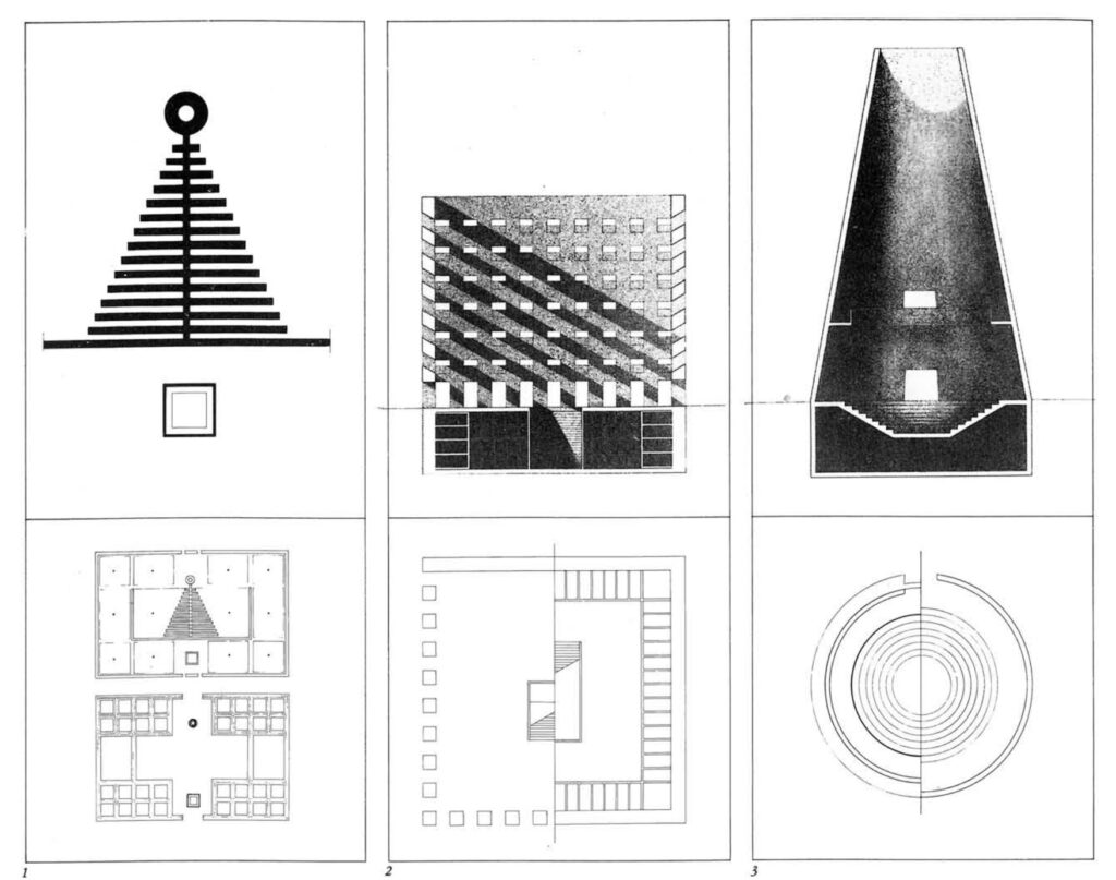 Junto a Gianni Braghieri, Rossi dispone una serie de elementos entre los que destacan dos de las grandes formas primarias de Le Corbusier, un gran cono nunca construido que debía contener la fosa común y un cubo naranja repleto de aberturas cuadradas. Un gran cubo que acapara todo el protagonismo y que no es otra cosa que un osario sin techo. Una construcción cerrada sobre sí misma y abierta al cielo, longitudinalmente atravesada por la luz que penetra en forma de haces a través de los vanos sin ventanas.