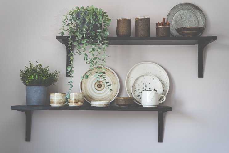 Exposición en vitrinas o estanterías: una excelente manera de exhibir tus platos decorativos más preciados. Organízalos de manera estética y armoniosa, alternando alturas, tamaños y diseños y combínalos con otros elementos como jarras, jarrones, libros o plantas y añade encanto a tus espacios.