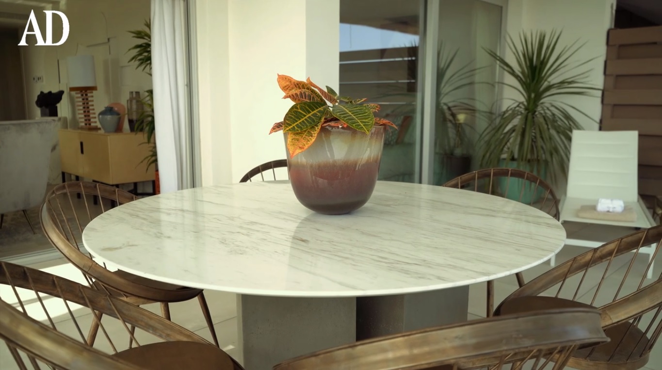 Y, sin duda, otro de los espacios que marcan la diferencia es la impresionante terraza, desde la que se contempla una de las mejores vistas del litoral malagueño. En ella, Silveira ha querido continuar con las texturas naturales que veíamos en el salón. Al igual que en el comedor, en el exterior encontramos una mesa de mármol, ahora redonda en lugar de rectangular, y distintos muebles con toques dorados y de latón que cohesionan los espacios en el interior y al aire libre.