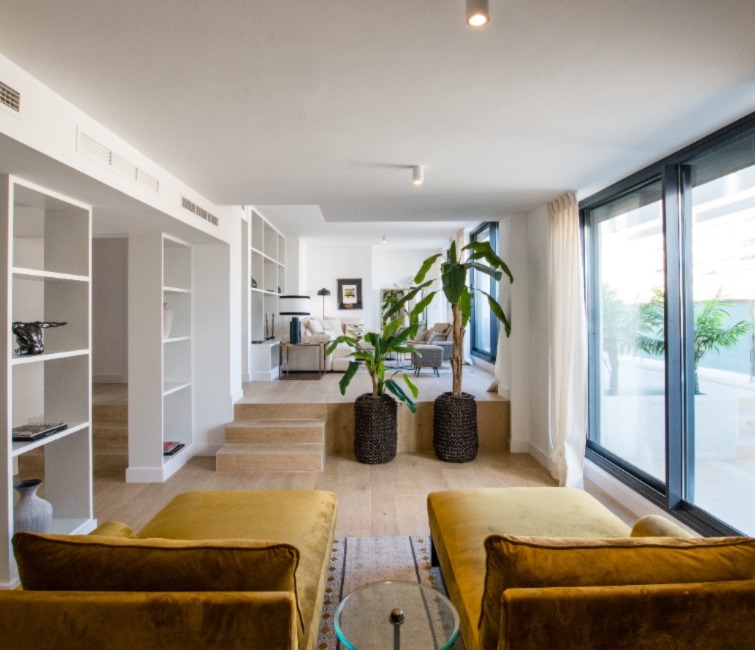 Utiliza muebles a medida para aprovechar cada centímetro, como estanterías abiertas de obra, que aumentan la amplitud y muebles cerrados para guardar tus enseres y conseguir que tu salón quede lo más liberado posible. También puedes optar por piezas que sean flexibles y fáciles de mover como sillas y mesas con patas finas y pequeñas. De esta forma, no pierdes funcionalidad y dejas pasar la luz sin sobrecargar la vista.