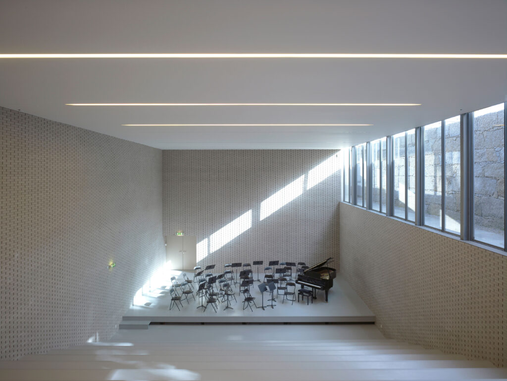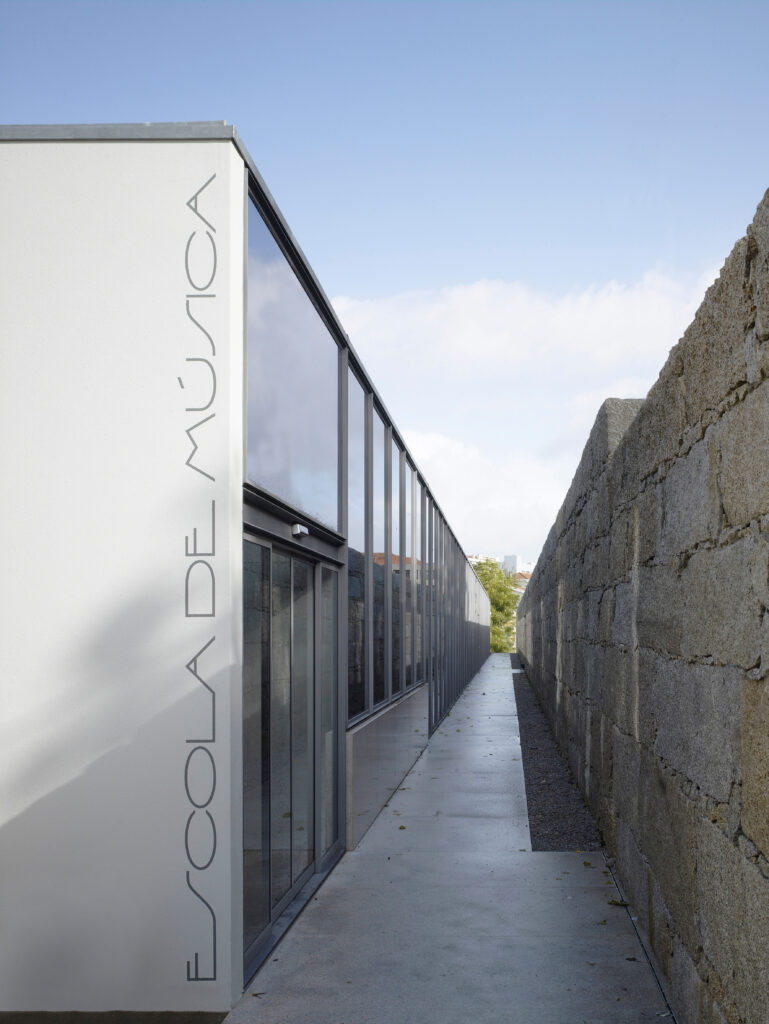 El interior, que había nacido para ser una calle, se transformó por fin en exterior. De Moura eliminó la cubierta y creó un pasaje ajardinado, flanqueado por las antiguas columnas descabezadas, sosteniendo el vacío y con la armadura del hormigón retorcida contra el cielo. Parece un pedazo moderno de Pompeya; la repetición clásica, la sucesión de columnas… Tiene el ritmo visual de un peristilo romano y la textura ferruginosa de una ruina industrial. El escenario perfecto para dar cabida a una nueva función: escuela de música y centro cultural. Tras décadas, un nuevo agente de cohesión espacial y social. Un uso distinto, con un mismo cometido.