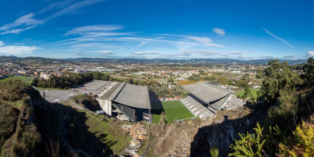 Porque en verdad se da esa suerte de revisión o reinterpretación en sus proyectos, incluso en aquellos que parecen libres de cualquier condicionamiento histórico, como el Estadio Municipal de Braga. Ya hemos adelantado que es su obra favorita y que, en donde ahora se juegan partidos, estaba la casa en la que nació su padre. Pero hay más y también tiene que ver con su padre y con otro estadio, uno más antiguo: una buena muestra de arquitectura fascista, que sigue en uso en la misma ciudad, el Estadio 1º de Maio. Allí iba de niño a ver los partidos, pero no se sentaba en las gradas, sino en la ladera del monte Picoto, donde el edificio se abría y permitía a los aficionados asistir a los encuentros deportivos sin necesidad de pagar entrada.