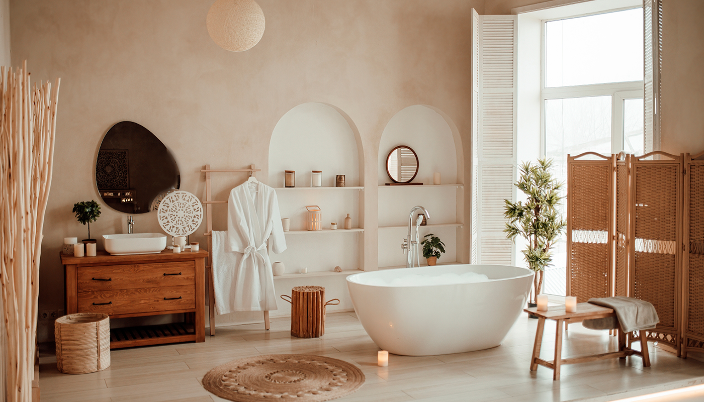 Juega combinando texturas -madera, metal, piedra o mármol- que pueden aparecer en elementos como marcos de espejo, estanterías, encimeras de lavabo o accesorios. Los materiales naturales como la piedra o la cerámica, además de dar un toque elegante, conectan el espacio con el mundo exterior. Introduce también distintos tejidos -algodón, lino, mimbre o ratán- para dar profundidad y calidez al baño.