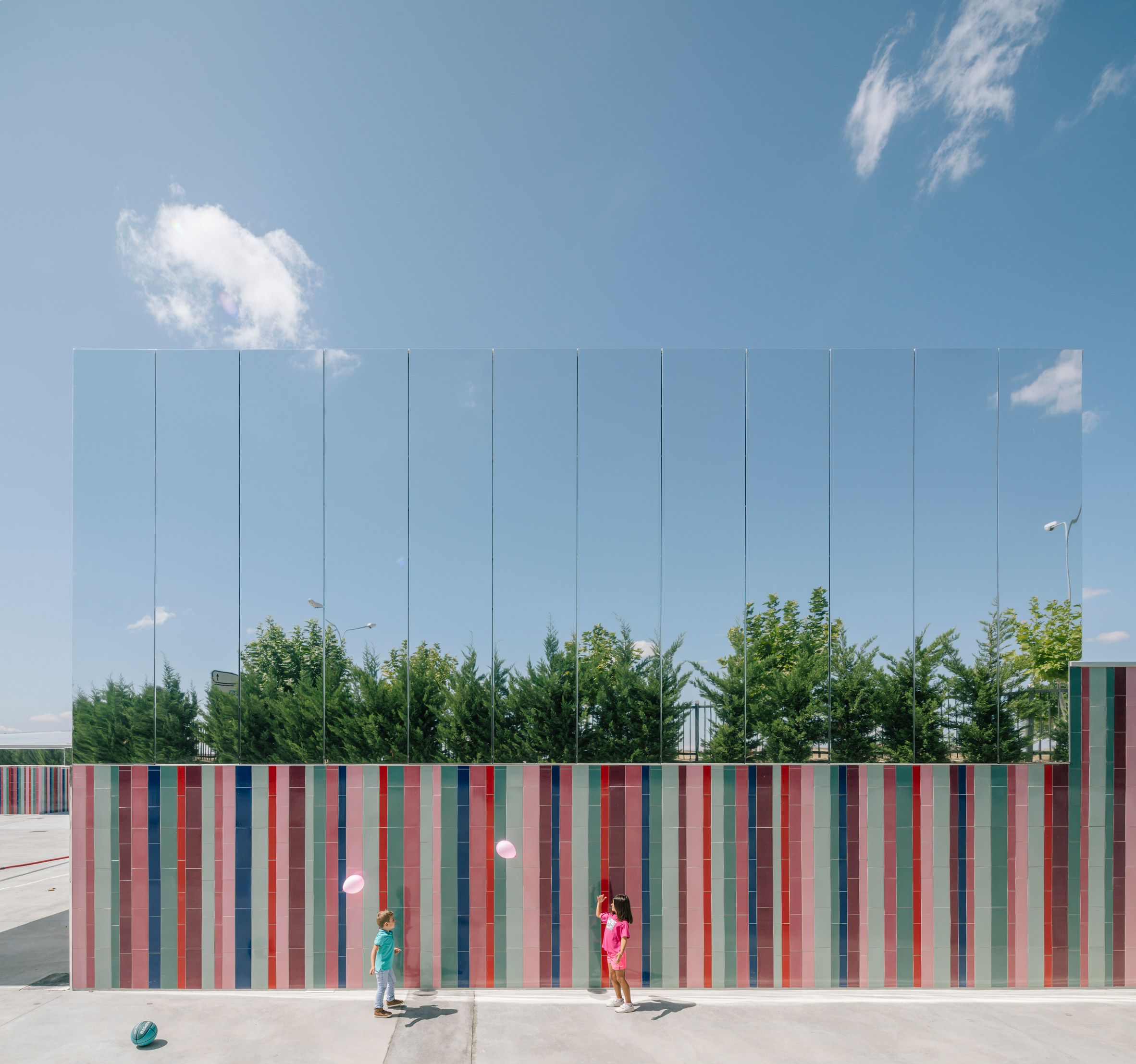 La utilización de espejos para minimizar la presencia de un edificio es uno de los trucos más llamativos. En este caso, los arquitectos de ABLM, decidieron convertir la planta superior de este colegio en un pedazo de cielo, literalmente. Y lo consiguieron. El efecto es impecable, lo que consigue aligerar el conjunto y potenciar su horizontalidad. Por el contrario, en el nivel inferior, las cerámicas de colores dan al proyecto su carácter desenfadado y cercano a quienes lo utilizan diariamente: niños y niñas de educación primaria. Todo un ejemplo de que los materiales y las posibilidades de fabricación que permiten las nuevas tecnologías permiten resultados estéticos cercanos a la magia.