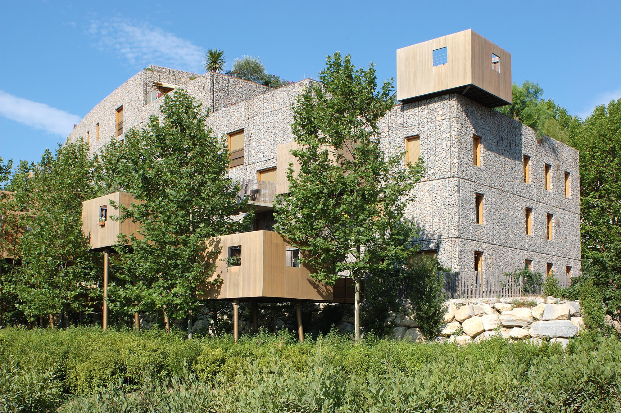 La estrategia de François -y no solo en este proyecto- consiste en crear proyectos que son un híbrido de naturaleza y arquitectura. Gracias a la incorporación de la vegetación como un elemento constructivo más, sus edificios no siempre se adaptan al paisaje, sino que llegar a crearlo. Al contrario que en otro de sus proyectos en el que camufla el edificio, en esta ocasión el bloque de viviendas surge como una formación rocosa rodeada de vegetación, una verdadera montaña cuyas paredes son piedras entre las que brotan plantas. Una piel vegetal que, unida a la arboleda que rodea el conjunto, hacen de este proyecto un hábitat natural en sí mismo.
