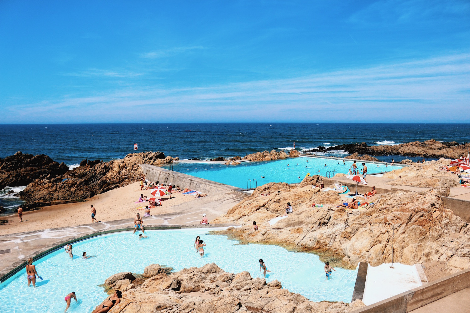 Seguimos en el Atlántico y subimos hasta Oporto, en Portugal, donde el mar nos regala paisajes de una belleza insuperable… Y olas, vientos y corrientes difícilmente predecibles. Para solucionar los problemas de seguridad y seguir disfrutando del espectacular entorno, las autoridades locales encargaron a un recién establecido Álvaro Siza la difícil labor de domesticar el océano. Conseguirlo le llevó cinco años, desde 1961 hasta 1966 y el resultado es sencillamente impresionante. Situadas sobre un macizo rocoso, los límites de las piscinas se mimetizan con los materiales naturales hasta el punto de parecer una formación creada por la erosión y el efecto de las mareas. Si quieres saber más sobre Siza, puedes echar un vistazo aquí.