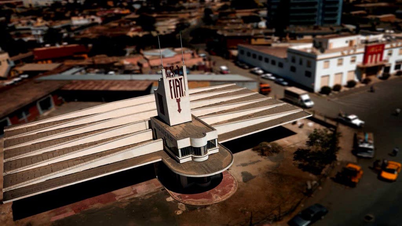 Diseñada en 1938 por Guiseppe Pettazzi, la Fiat Tagliero parece a punto de despegar en la capital de Eritrea. Sus espectaculares voladizos de 30 metros de longitud y sus reminiscencias art-decó son parte de una extensa y vanguardista huella arquitectónica que dejó la ocupación italiana en África durante las primeras décadas del siglo XX.