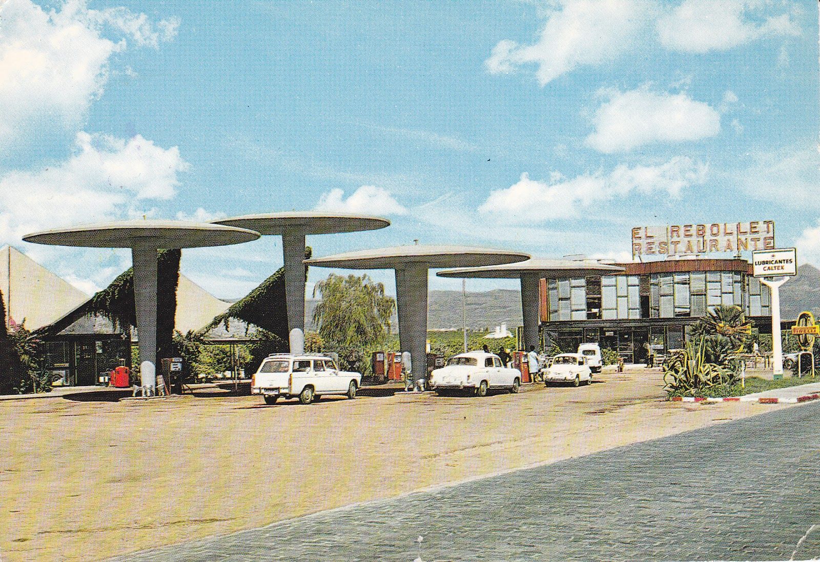 Terminada en 1962, esta gasolinera en la carretera de Gandía, en Valencia, recoge lo mejor de Félix Candela y, además, incluye un restaurante -hoy desmantelado- claramente inspirado en el célebre Edificio Ariston de Breuer en Argentina. Sus cinco paraguas de hormigón, de alturas distintas, se completan con una caseta protegida por una cubierta de paraboloides hiperbólicos. Una maravilla devorada por el crecimiento urbanístico, pero conservada y en uso. Lástima no poder decir lo mismo del restaurante.