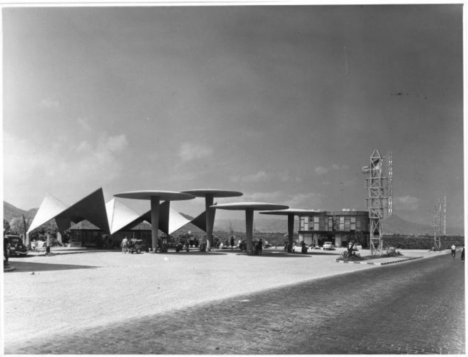 La referencia inmediata es Félix Candelas. Este genial arquitecto español, exiliado en México, fue uno de los grandes maestros en la utilización del paraboloide hiperbólico. Entre sus múltiples proyectos de corte industrial, destaca la utilización del paraguas invertido de hormigón que aprovecha la columna única como desagüe para las aguas pluviales. Una solución que, como ahora descubriremos, ya utilizó Arne Jacobsen en los años 30, precisamente para una gasolinera.