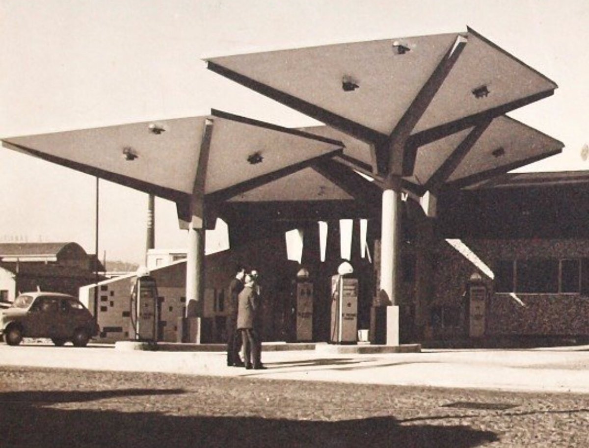 Pero la cosa no queda aquí: los muy fosterianos podrían decir que lo de Repsol no es exactamente un paraguas, sino una pirámide invertida… Y tendrían razón, justo como la gasolinera de Rubens Henríquez en Santa Cruz de Tenerife, o la gasolinera Meyfer en Gijón proyectada en 1959. Una buena muestra de que una gran idea puede evolucionar y perfeccionarse sin perder su esencia. Más bien al contrario, porque el resultado final, siempre provisional, es la suma del trabajo de grandes arquitectos.