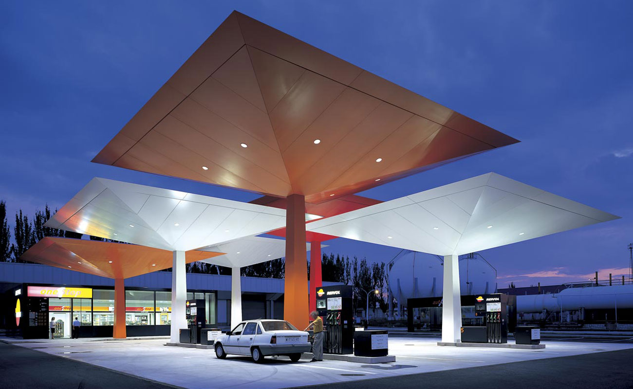 En el caso de las gasolineras, no hace falta ser un entendido en arquitectura para pensar inmediatamente en Repsol. Como veremos enseguida, no solo han conseguido un sistema modular sencillo, efectivo y replicable, además lo han convertido en parte de su imagen de marca.