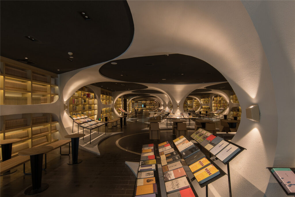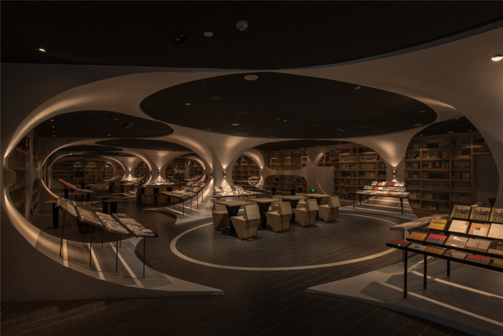 Esta es probablemente la primera de las librerías Zhongshuge que llegó a Instagram y, por tanto, a nuestro imaginario colectivo. Nada más verla, es inevitable pesar: “eso no existe”, o “es imposible”, o, para los más entendidos, el consabido “eso es un render”. Pero no, no es un render; son 1300 metros cuadrados en la tercera y cuarta planta del centro comercial Zodi Plaza.
