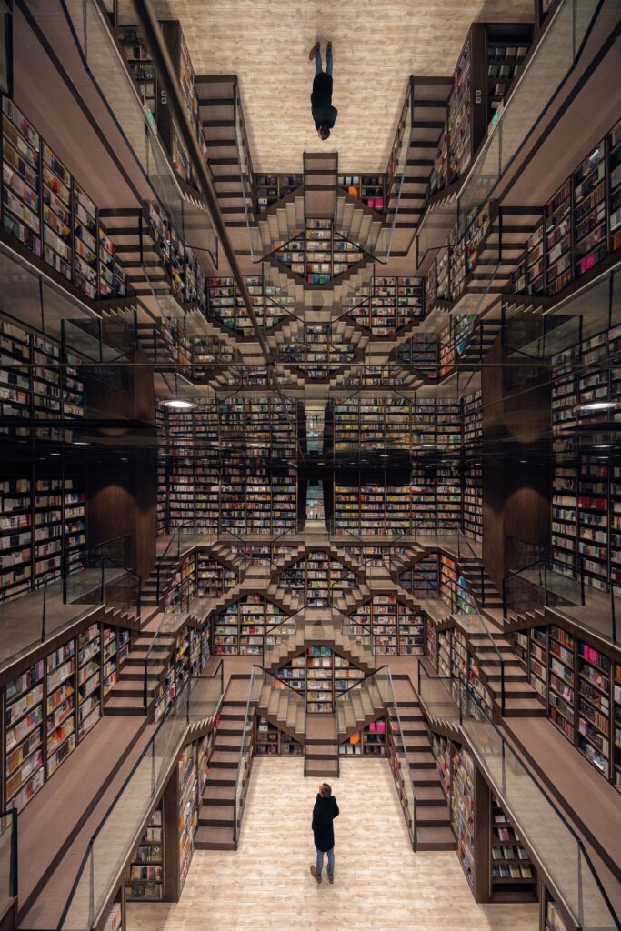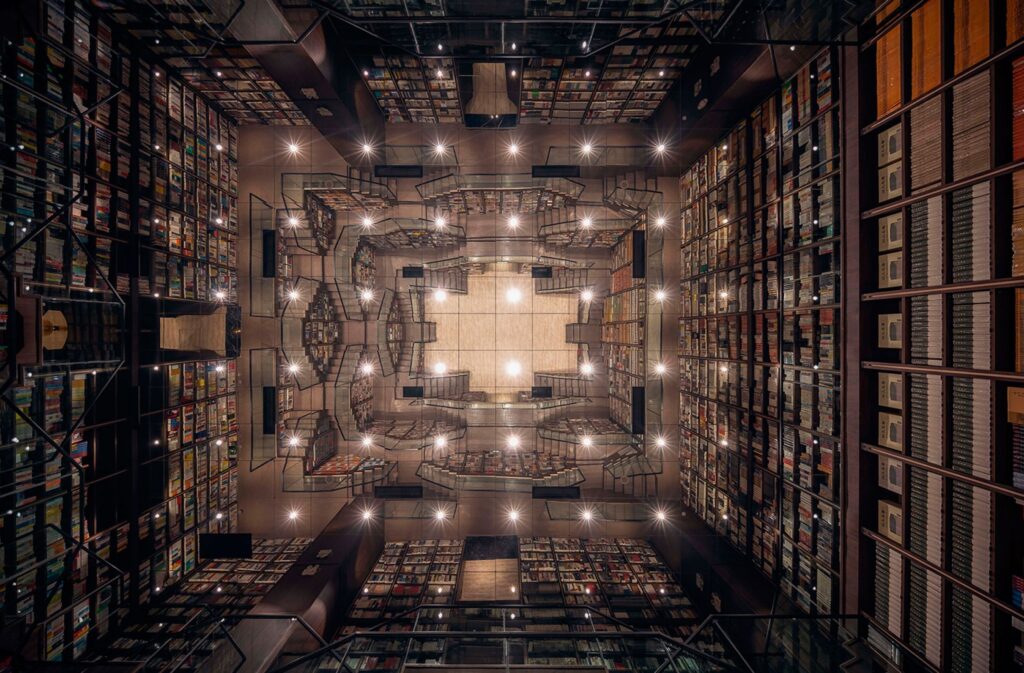 De nuevo, tras la fachada de vidrio, encontramos el paraíso de cualquier lector. Con la ilusión óptica del techo espejado, los libros se extienden como si estuvieran dispuestos sobre la estructura de una catedral, o como si ellos mismos fueran las piezas que la componen. Nadie podría resistirse a subir por estas escaleras e ir descubriendo libro tras libro, como si estuviese recorriendo el auténtico camino hacia el conocimiento.