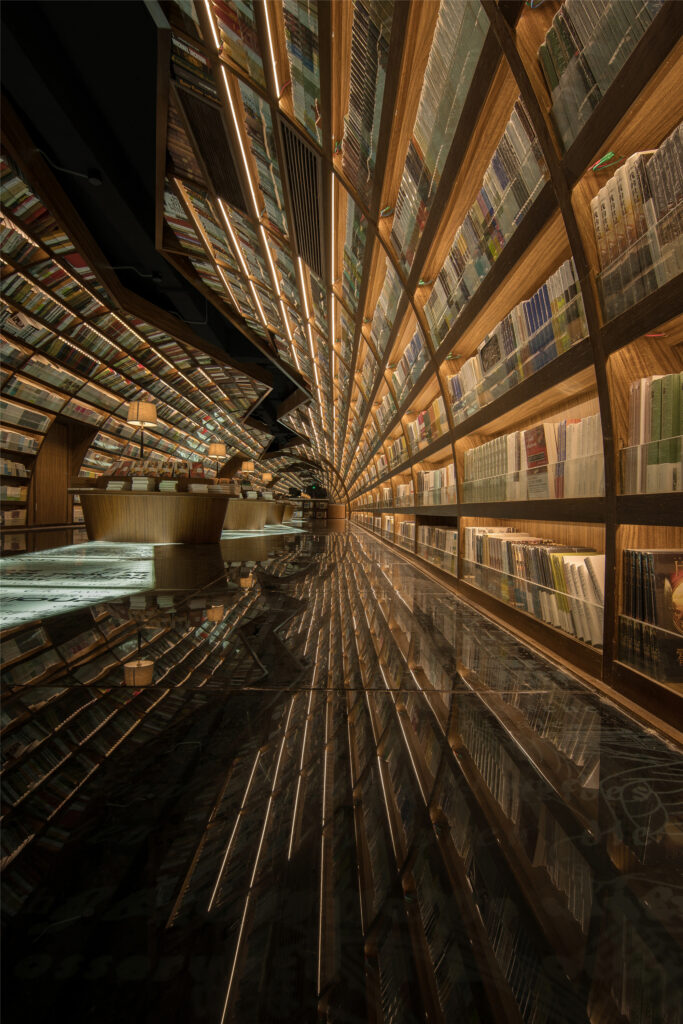 En la librería de Yangzhou, no estamos en un centro comercial, sino a la orilla del mar, aunque el concepto es el mismo. Una fachada de vidrio cuajada de letras que da paso al mundo hermético de la literatura. Y, para esta ocasión, en lugar de extender el espacio hacia las alturas, la tienda se despliega ante nosotros como un túnel interminable. En esta perspectiva irreal, las paredes se ciernen sobre nosotros cargadas de libros y, justo en el centro de la bóveda, una gran grieta negra zigzaguea hasta perderse en su propio punto de fuga.