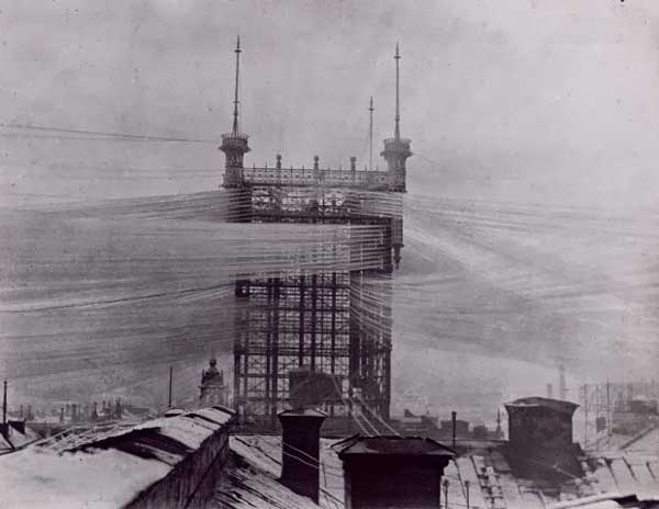 Sin embargo, los inicios nos ofrecen ejemplos mucho más llamativos. Más concretamente, la estructura que coronaba el edificio de la compañía telefónica de Estocolmo a finales del siglo XIX. Con la premisa de “Un teléfono en cada casa”, vino la otra de “un cable para cada teléfono” y todos comenzaban en el tejado de la Stockholms Allmänna Telefon. Este monstruo de acero recogía las líneas de sus abonados hasta aglutinar 4000 cables que surcaban el cielo de la capital sueca. Años más tarde, surgió la posibilidad de instalar en cableado en el subsuelo y, tras un incendio en 1952, la torre fue demolida.