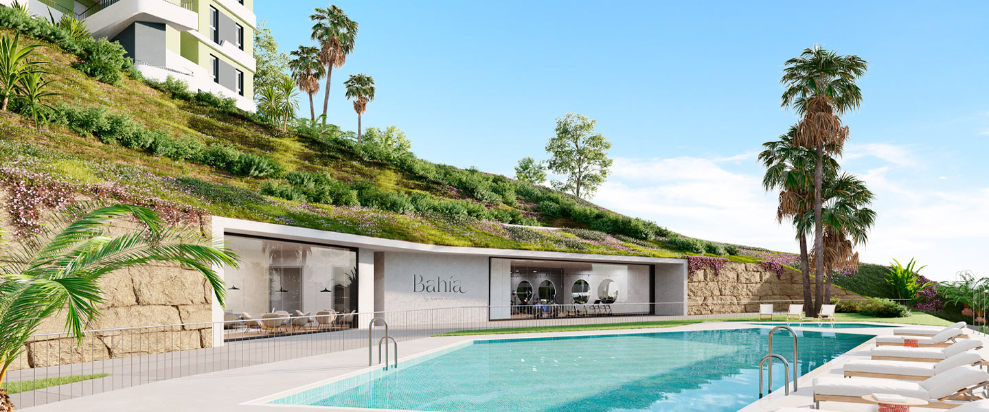 Piscina con solarium en el residencial Bahía situada en La Cala de Mijas