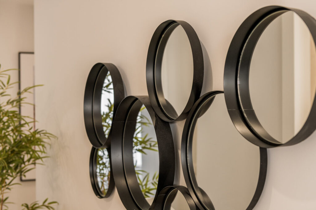 Una de las formas más originales de decorar con espejos es creando distintas composiciones. Este tipo de decoraciones suele hacerse con espejos de pequeño tamaño que juntos crean un espacio de diseño.