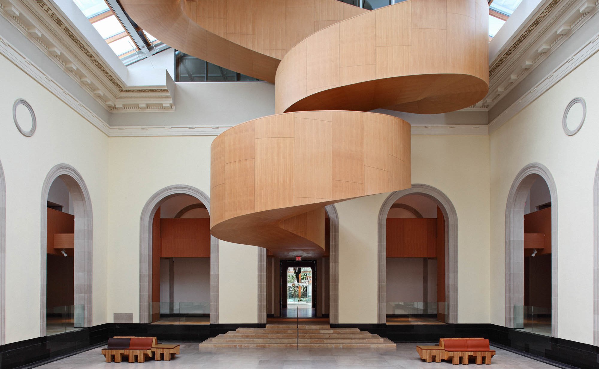 El primer edificio del Pritzker canadiense en su ciudad natal contiene una obra de arte que forma parte de su estructura; su preciosa escalera parece una serpentina ingrávida, suspendida sobre el hall desde el arco de entrada, hasta el techo acristalado. La calidez de la madera de abeto y sus formas sinuosas contrastan con la sobriedad del resto del espacio, una antigua mansión victoriana integrada en el enorme conjunto diseñado por Ghery.