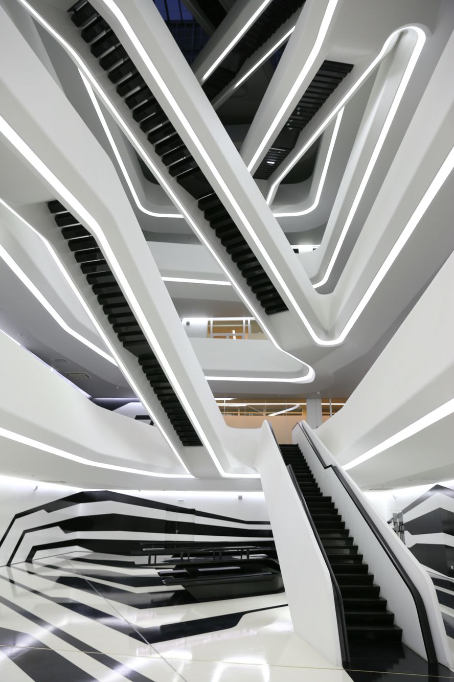 Una joya de la Pritzker iraquí situada en un distrito en plena expansión de la capital rusa. En el exterior, bajo la luz moscovita, destacan las distintas plantas que se sitúan, como aplastadas una sobre otra, desplazadas longitudinalmente, con distintos voladizos y balcones. Y, una vez dentro, la escalera brilla con luz propia, llenando el espacio del atrio y sirviendo de eje vertebrador que interconecta las distintas empresas y fomenta la comunicación y el encuentro entre los trabajadores. Eso por no hablar de su increíble diseño. Sencillamente fascinante.
