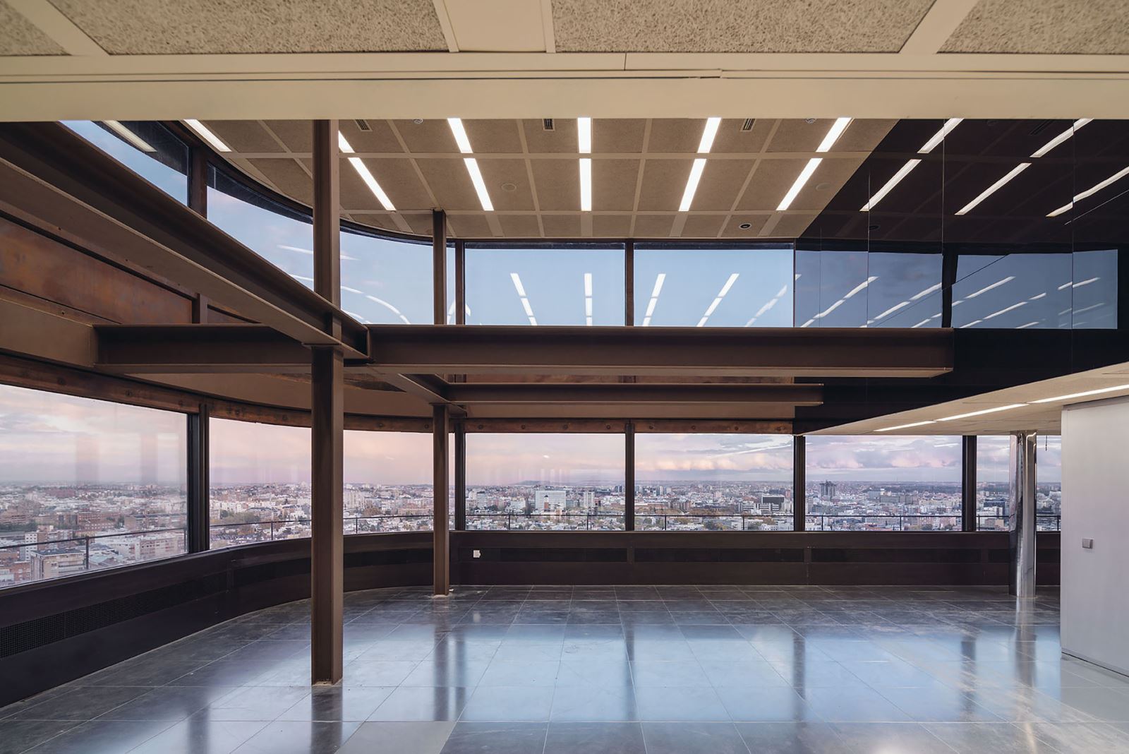Todo ha cambiado para que las vistas sean las mismas de siempre. Madrid a tus pies a través de las cristaleras que recorren de forma ininterrumpida cada planta, llegando a curvarse en las esquinas para no perder detalle. Un futuro asegurado para este edificio cuya estructura se asienta en dos pilares que sortean a horcajadas el túnel del ferrocarril que transcurre bajo sus cimientos.