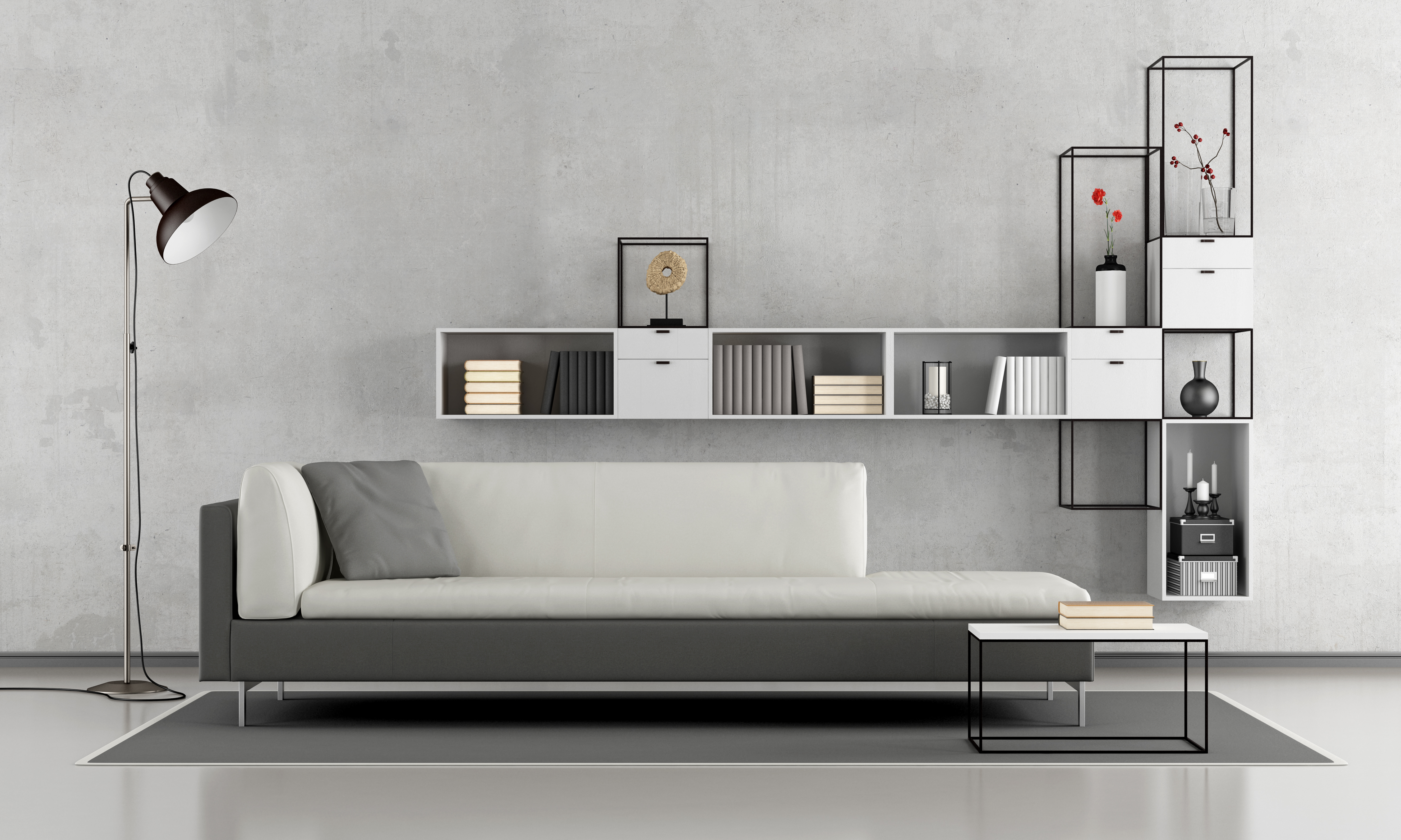 Decoración minimalista con estantería flotante