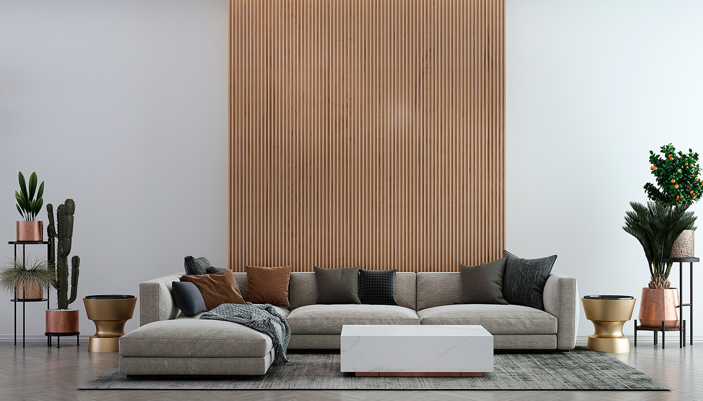 Si buscas una atmósfera con un toque diferente, puedes optar por un acabado en madera en la pared de detrás del sofá. La palillería, de rabiosa actualidad, realza la belleza natural de la madera y aporta una sensación de calma y atemporalidad a tu espacio, creando el entorno ideal si buscas una sala de estar relajante, acogedora, minimalista y moderna.