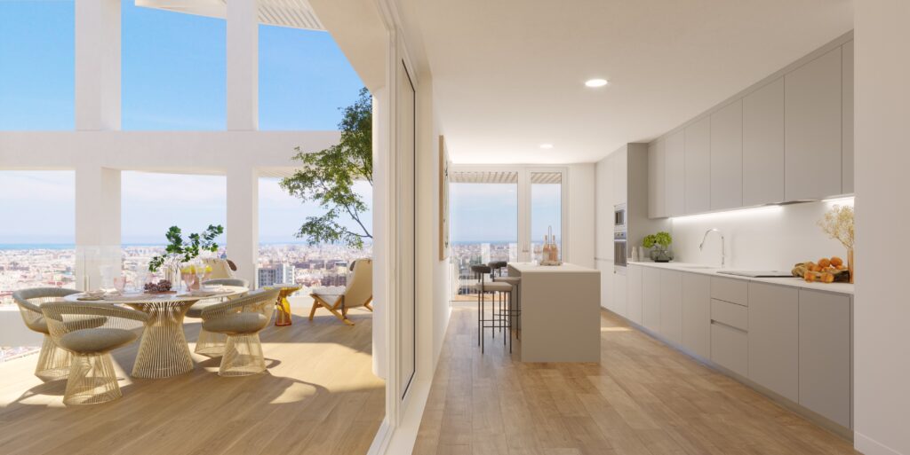 En todos nuestros proyectos, su integración en el entorno, ya sea urbano o natural, es fundamental. Por eso, desde su planteamiento, Ikon ha sido un residencial ideado para Valencia. La blancura de su fachada es un guiño al sol del Mediterráneo, mientras que su piscina y su jardín de plantas autóctonas nos transportan de inmediato a la costa. Esa frontera natural que se dibuja en el horizonte y que siempre hemos tenido presente, sobre todo a la hora de diseñar los áticos, en los que nos encontramos con una vista que abarca el litoral, la huerta y las montañas.