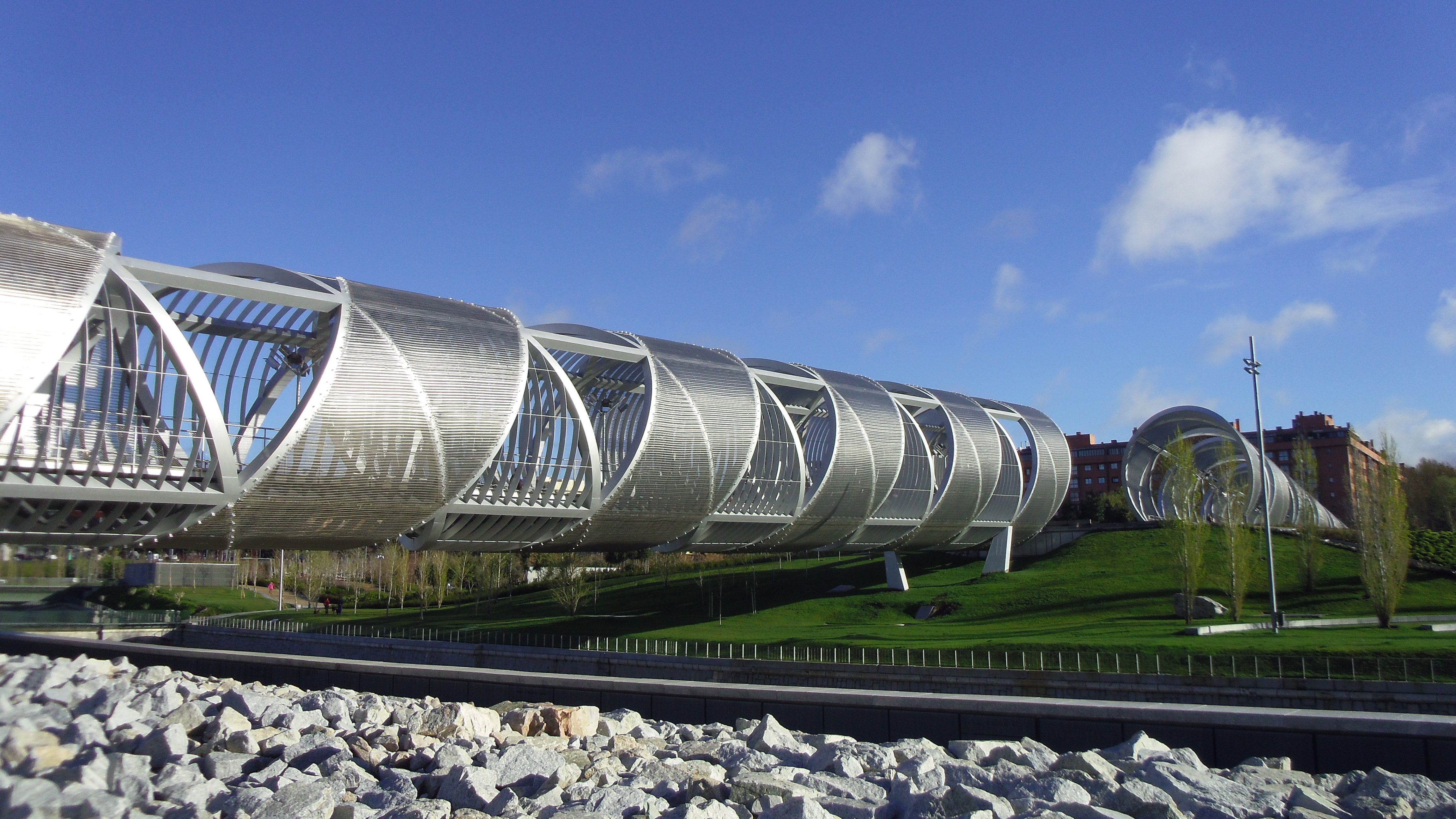 El puente de Arganzuela no forma parte de esos titanes de la ingeniería que acabamos de ver en Cádiz y Bilbao. Sus dimensiones son más modestas, pero su papel es crucial para Madrid Río, una de las remodelaciones urbanísticas más ambiciosas de Madrid. Un gran proyecto que empezó con el soterramiento de la M-30 Sur y que continúa con el progresivo ajardinamiento de las márgenes del Manzanares. Sus 278 metros vuelan sobre el parque y el río para unir los distritos de Carabanchel y Arganzuela y solventar parte de la brecha geográfica y social que la principal circunvalación de la capital ha ocasionado entre los barrios de la Almendra y los de fuera. Proyectado por Dominique Perrault, quien comandó también el diseño de la Caja Mágica, fue inaugurado en 2011 y su silueta helicoidal ya es todo un icono madrileño que ha redefinido y revolucionado los límites meridionales de la ciudad.