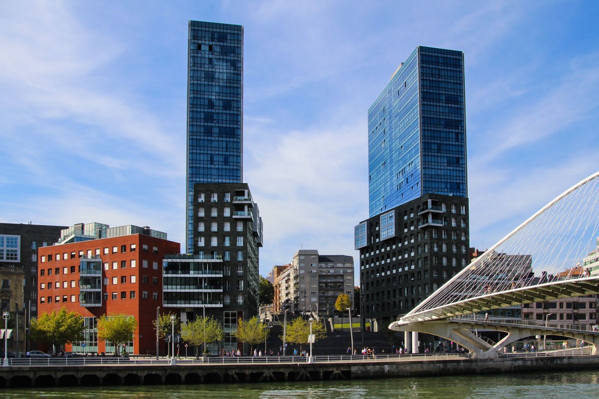 En euskera, Puerta de Isozaki. Un espectacular complejo de siete edificios que el arquitecto diseñó en colaboración con Iñaki Aurrekoetxea y que se ha consolidado, junto al Guggenheim, como uno de los símbolos de la transformación urbanística de Bilbao. Donde en el pasado estuvo el antiguo Depósito Franco, hoy despuntan dos torres gemelas de 82 metros. Desde su posición privilegiada, dominan el Muelle de Uribitarte y se erigen como punto de referencia en esta vanguardista ciudad renacida en torno a la Ría del Nervión.