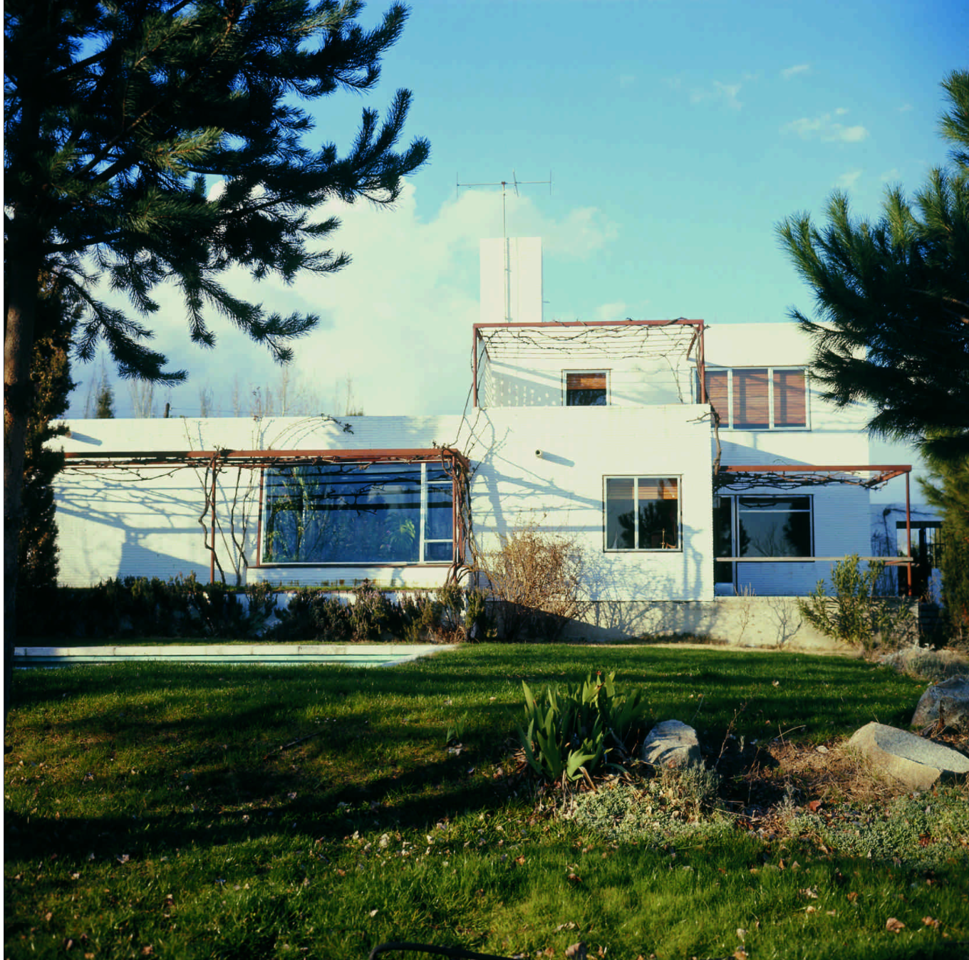 Vista desde fuera, enseguida se aprecia que el arquitecto no renunció a su gusto por el uso del ladrillo. A pesar de la blancura de los volúmenes que componen la casa, es ladrillo visto el material de acabado, tanto exterior como en muchos paramentos interiores, solo que encalado. Esta elección también responde a esa doble dimensión, aparentemente contradictoria, entre racionalista y tradicional, solo que, en esta ocasión, además, ha ayudado a conservar los muros en mejor estado que otras viviendas de la urbanización en las que el ladrillo se dejó en crudo.