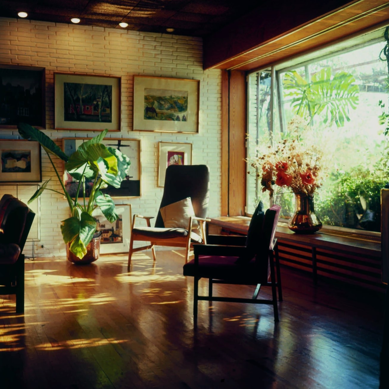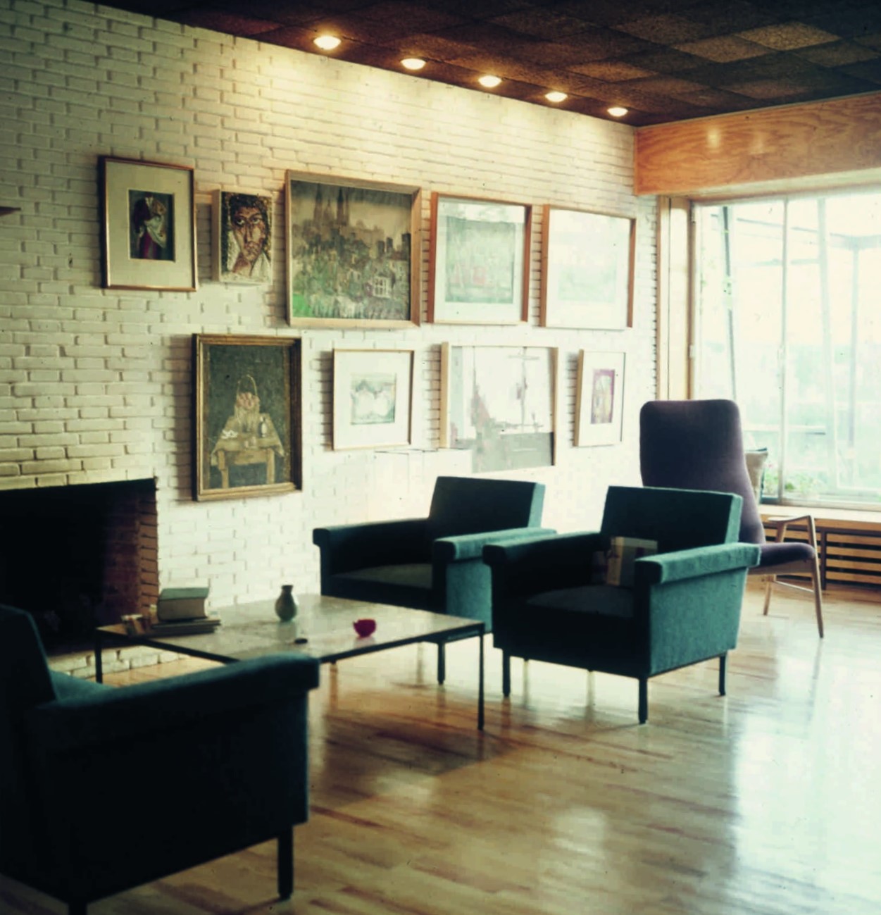 La composición de los espacios es sencilla. Entramos a un gran vestíbulo y podemos elegir; de frente, una puerta pequeña nos lleva a los dormitorios y la derecha una gran puerta corredera nos abre paso al salón comedor. En este último espacio, nos encontramos con una gran superficie dominada por dos elementos, la pared de ladrillo visto encalada y una enorme ventana con jardinera que nos recuerda a las del arquitecto danés Arne Jacobsen. En cuanto a la zona de dormitorios, tras la pequeña puerta se abre un enorme pasillo que servía de cuarto de juegos, ya que, salvo la habitación principal, el resto cuentan con unas dimensiones más bien reducidas, lo esencial para dormir y, si acaso, estudiar, lo que traslada el resto de actividades a las zonas sociales de la vivienda.