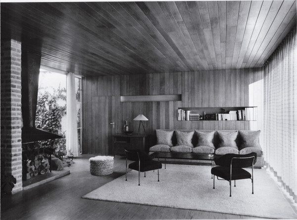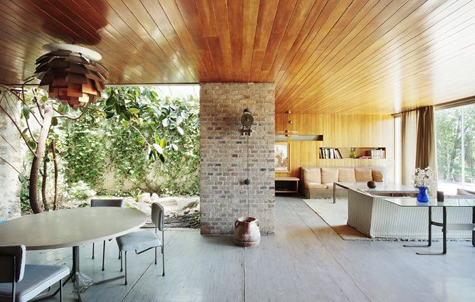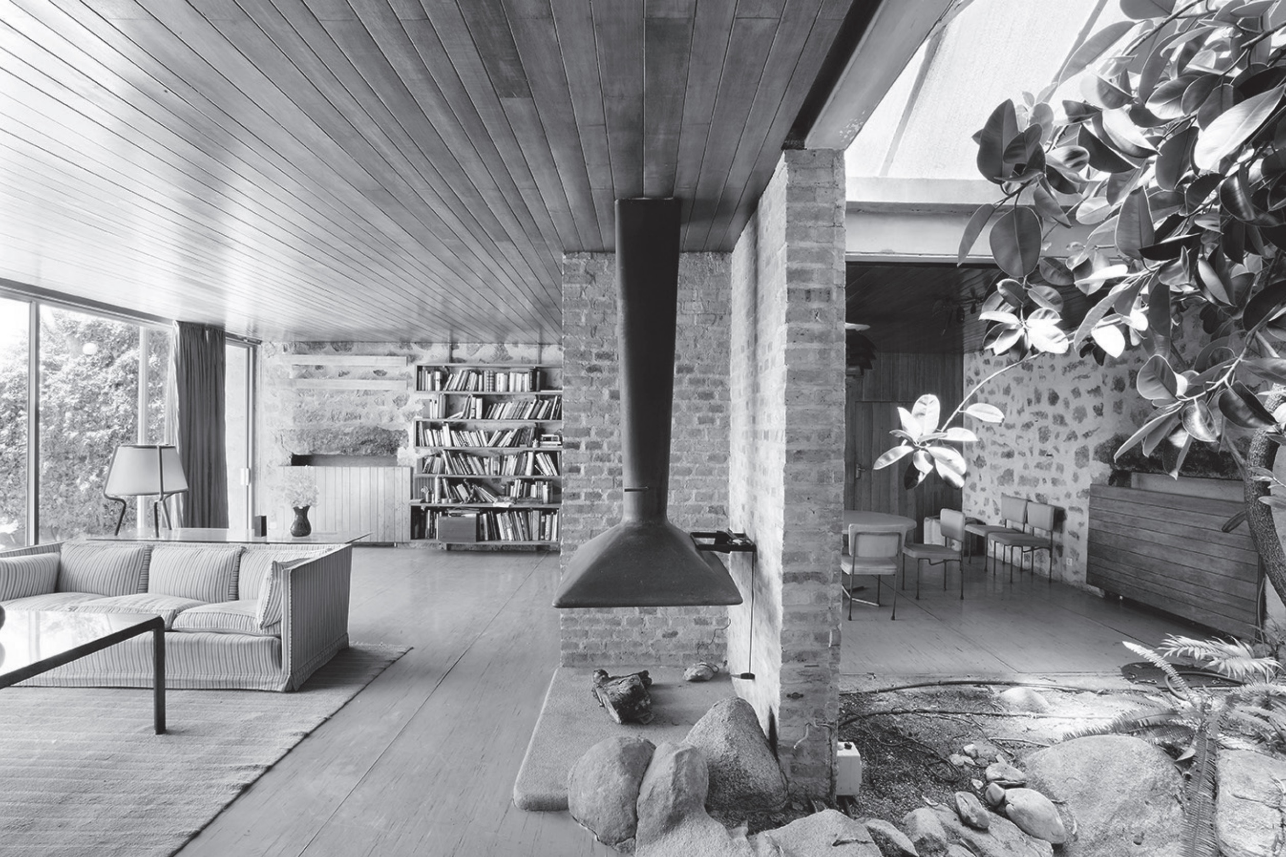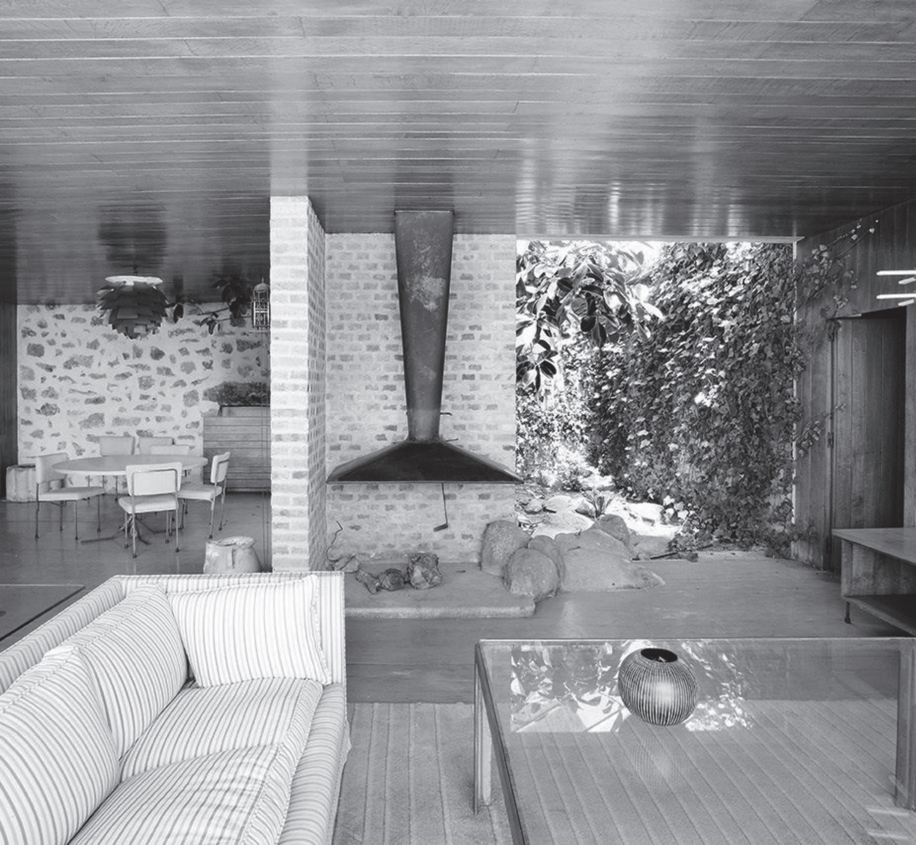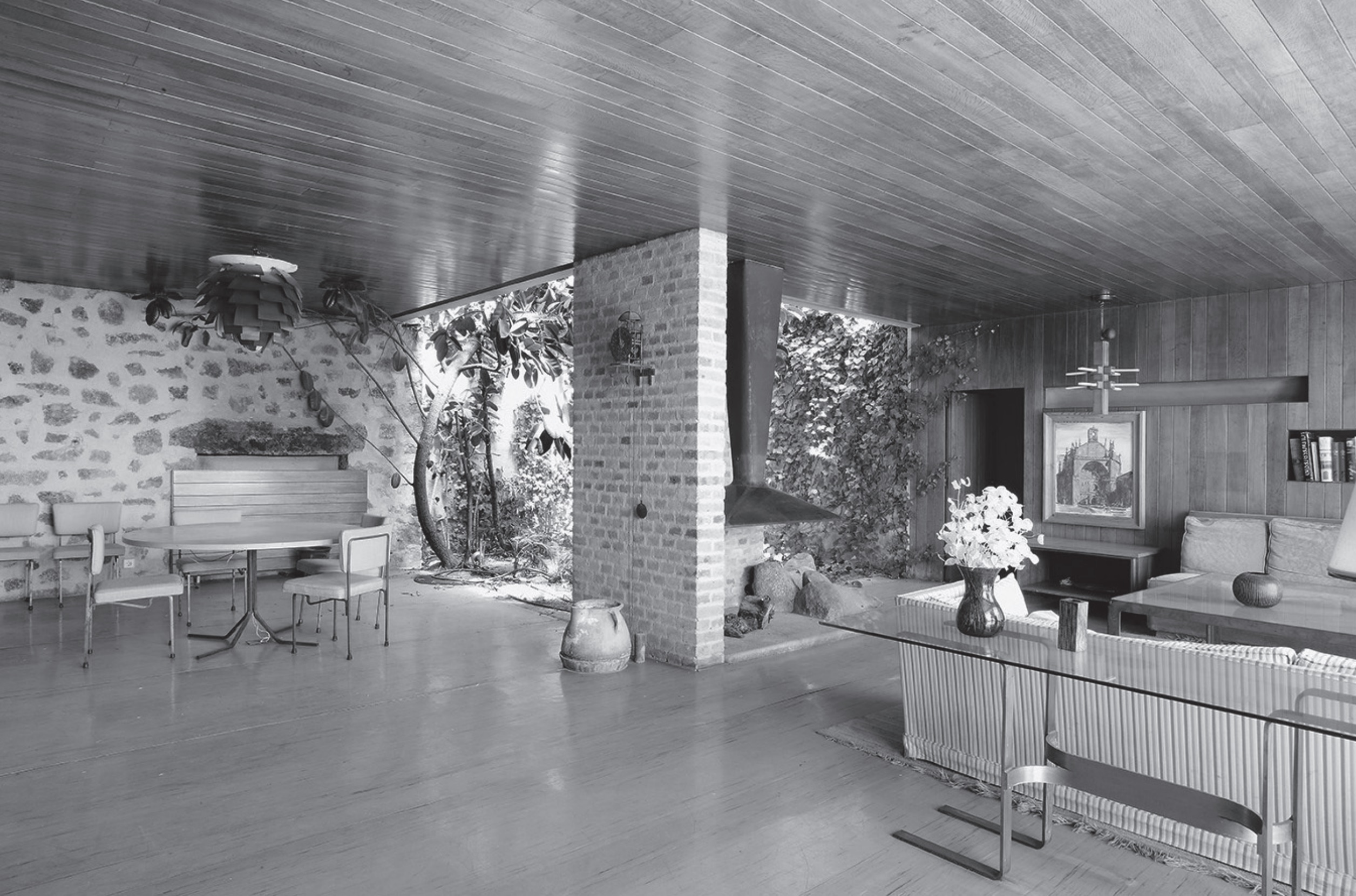 Vista de la chimenea y del jardín interior de la casa de Fisac.