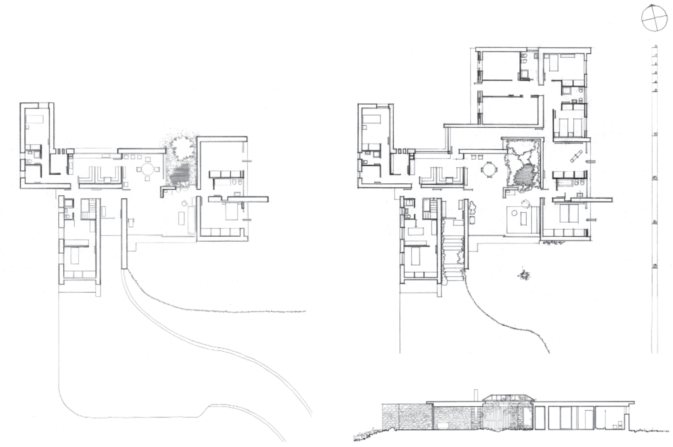 Llama la atención la maestría con que se amplía la casa, la naturalidad con que se integran los nuevos espacios sin afectar ni perjudicar el esquema ortogonal de los primeros muros. Bien parece que estas ampliaciones estuvieran contempladas desde un principio, aunque la realidad es que su perfecto acoplamiento responde al buen hacer del arquitecto y a su gran visión espacial.