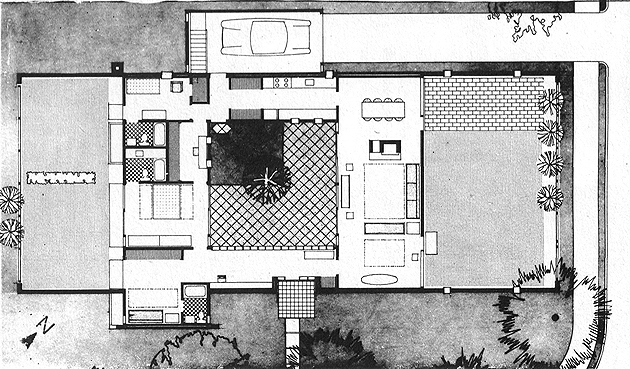 La casa-patio no tenía patio en los primeros croquis. Si tenía en cambio los mismos muros que delimitaban la parcela, en lugar del típico jardín delantero tan estadounidense que Sert aborrecía. Así, el proyecto final es una casa sin fachadas, pues apenas hay huecos en sus muros exteriores. Un ejercicio de simplicidad que, no obstante, encierra ciertas curiosidades, como su respeto a las proporciones establecidas por Le Corbusier en el modulor, o a la proporción áurea en las medidas de las habitaciones.
