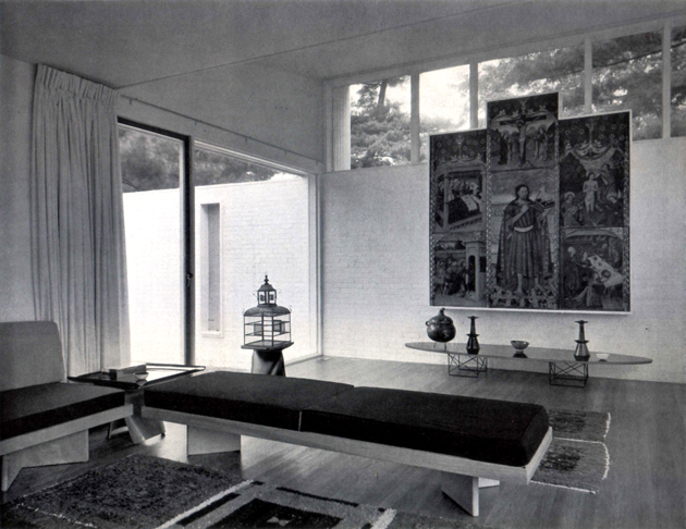 La gran colección de arte que poseía Sert se dispuso a lo largo de la casa sin caer en la acumulación. Cada pieza ocupaba un espacio que resaltaba sus cualidades y le brindaba un protagonismo específico en el conjunto de las obras expuestas. De hecho, algunos espacios y elementos se diseñaron teniendo en cuenta la obra de arte con la que debían relacionarse visualmente. Un buen ejemplo es el banco tricolor de la sala de estar, cuyas medidas y colores se correspondían con el cuadro que Miró había pintado a propósito para ocupar ese lugar. Un compendio de tesoros, entre los que se encontraban esculturas de Calder, o Fernand Léger, pinturas de Le Corbusier, un espectacular retablo gótico y un gran mural de Constantino Nivola, que decoraba una de las paredes del patio trasero.