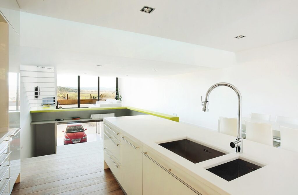 En el interior, bañado por la luz, los espacios se escalonan y los techos se abren para permitir también la iluminación cenital de la planta inferior. Cada nivel se diferencia del resto sin aislarse y la casa se recorre de manera natural, desde el garaje, también incluido en la visión general de los espacios, hasta la última planta, siempre con el horizonte como telón de fondo.