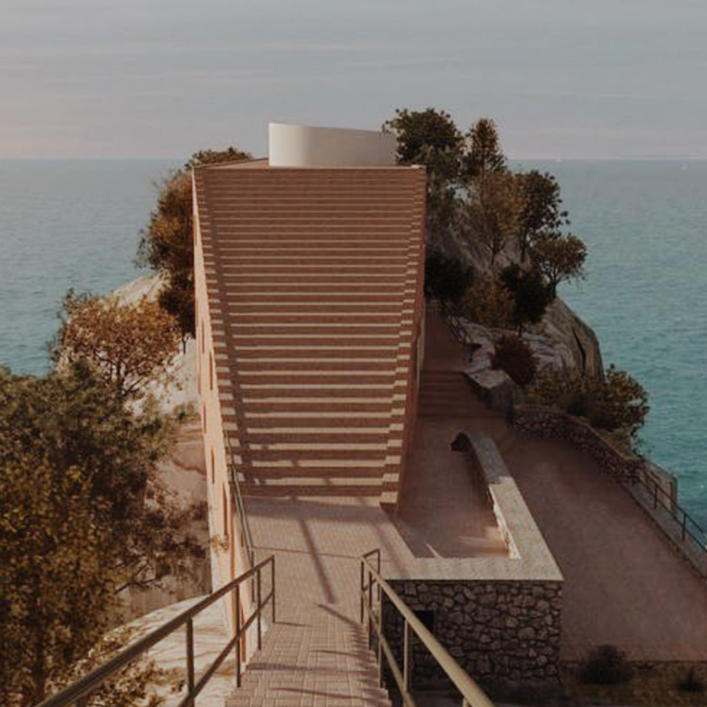 La pureza de los volúmenes y la forma en que aparecen posados sobre la ladera se dinamiza con una escalera en zigzag que conecta y acompaña el ascenso de los módulos, los cuales van disminuyendo de tamaño desde el primero, en la base, hasta el cuarto, el último peldaño. Uno se apoya en el otro y los dos últimos se despegan de la rasante sobre muros de piedra. En cuanto a la distribución, en el primer nivel, encontramos una terraza, un cuarto de estar, un comedor y una cocina y en los otros tres, un dormitorio y un aseo. Una propuesta que permite tener vistas del mar en todos los espacios y que busca la privacidad absoluta de cada módulo, máxime si tenemos en cuenta que la escalera que los une discurre a cielo abierto.