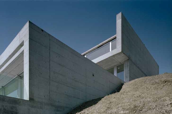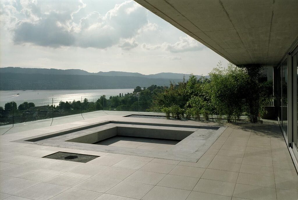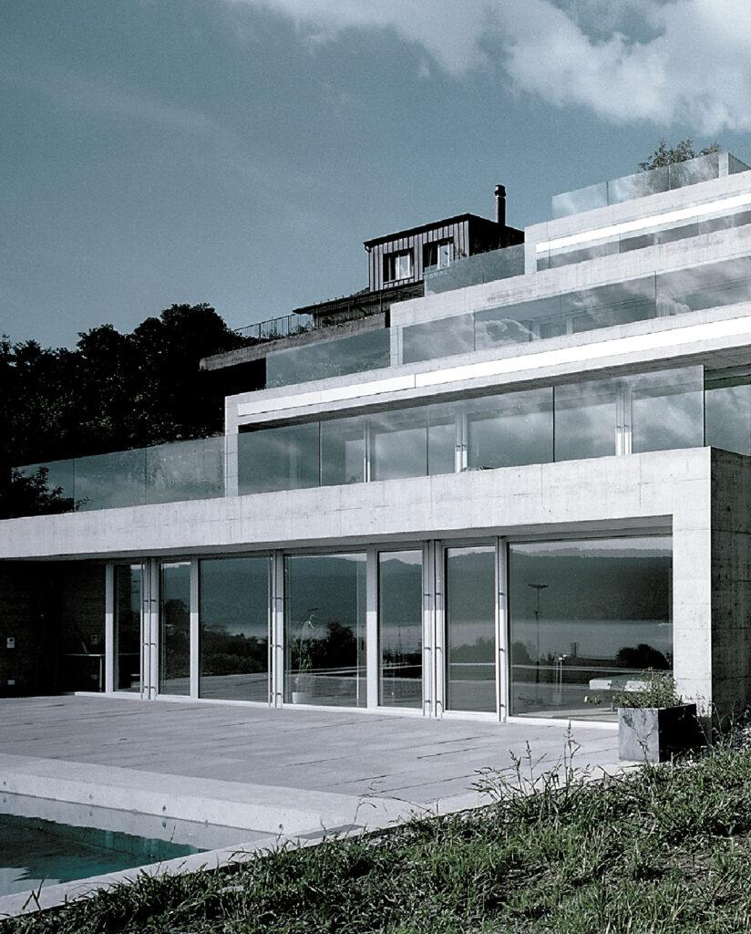 Los seis volúmenes se entierran parcialmente, emergiendo de la tierra con una sola cara acristalada por completo. El resto adquiere la apariencia de una caja de hormigón impenetrable, mientras que los espacios interiores se inundan de luz y se abren al horizonte y al lago Zúrich, además de contar con una amplia terraza a salvo de miradas indiscretas.