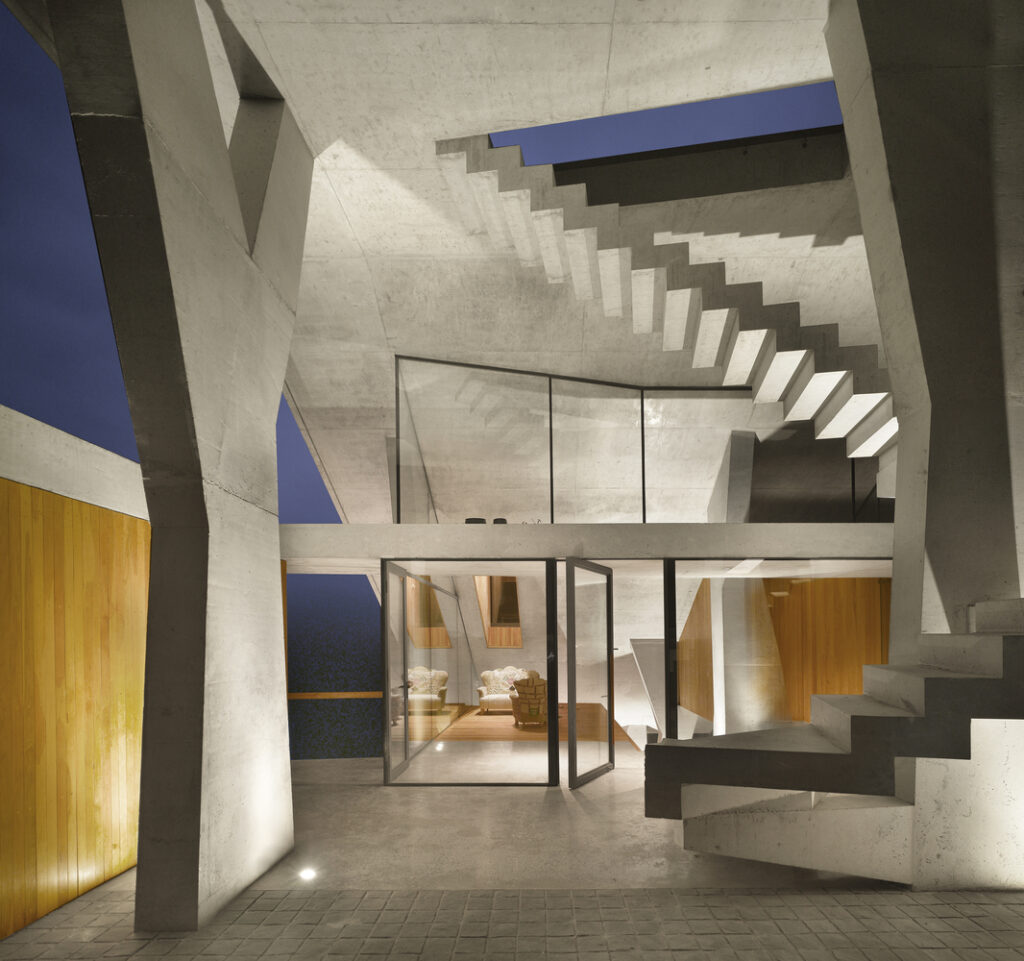 El resultado es una zona habitable sobre la cubierta, para disfrutar de la impresionante panorámica marítima, y un gran espacio diagonal bajo ella, donde, de forma continua, se suceden los 11 niveles y las 7 escaleras que modelan las estancias más públicas de la vivienda.