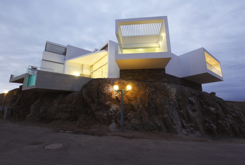 Volvemos al presente, sin salir de Perú, con este proyecto de Vértice Arquitectos, que guarda cierta continuidad con el proyecto de Weberhofer. Al igual que la casa Fernandini, Las Lomas crece sobre un farallón rocoso y sus volúmenes giran sobre su eje para abarcar una vista panorámica sobre el océano Pacífico.