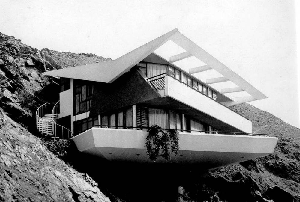 Walter Weberhofer diseñó ocho espectaculares casas en Santa María del Mar, cerca de Lima. Esta es la primera y, sin duda, la más célebre de todas. Su angulosa silueta de plataformas horizontales parece flotar sobre las rocas que la sostienen, extendiéndose hacia el mar sobre el vacío del acantilado.