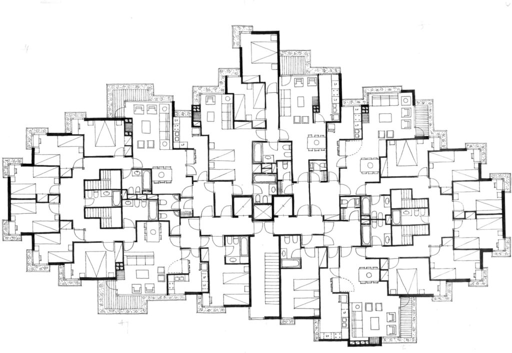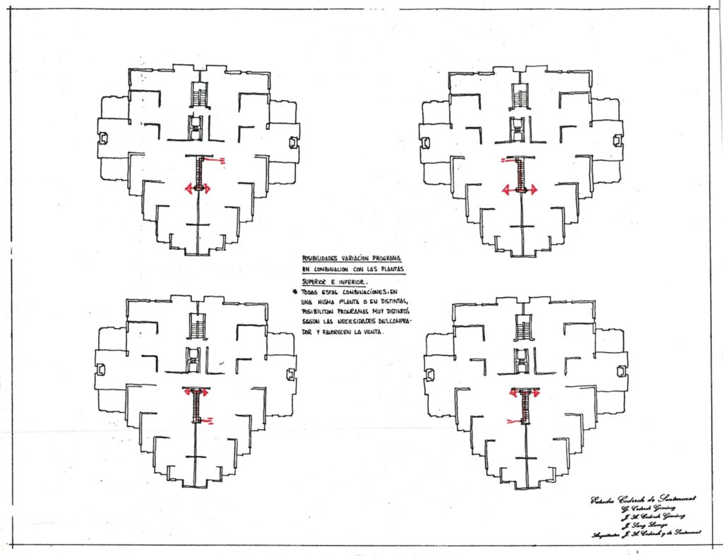 Sobre el papel funcionaba, pero, por una vez, decidió ir más lejos. No se quedó en la planta, sino que empezó a pensar en alzados. Corría 1969 y tenía fresca una solución que había empleado en el proyecto de Cocheras. Una vez más, la clave estaba en los armarios, que no tenían forjado, lo que permitía unir los pisos verticalmente mediante una escalera de un tramo. Aquello posibilitó una gran flexibilidad comercial en el proyecto original, pero, llevado al extremo y sumado a la modularidad horizontal, podía dar lugar a un edificio que funcionase como un verdadero cubo de Rubik.