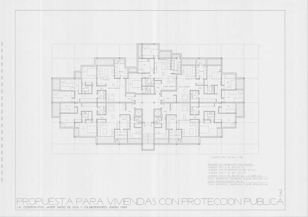 Si vemos las plantas de ambos edificios, reconoceremos de inmediato esas fachadas quebradas tan características de su arquitectura. De hecho, fue en el edificio de Cocheras donde hizo un descubrimiento que para él fue una auténtica revelación: consiguió establecer un sistema de estructura invariable que permitía plantear un abanico de distribuciones enorme. Es decir, una infinidad de tipologías que partían de un esquema rígido. Si ponía la cocina, el salón y una habitación con baño en un extremo, el resto de las habitaciones quedarían al otro y podían ser compartidas por dos viviendas. Solo tenías que decidir cuántas necesitabas y bastaría con quitar un armario o ponerlo. Entrar y salir del apartamento de al lado. Mover el tabique y ampliar o menguar. Desde un dormitorio hasta seis. ¿Por qué no?