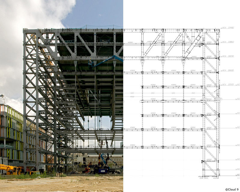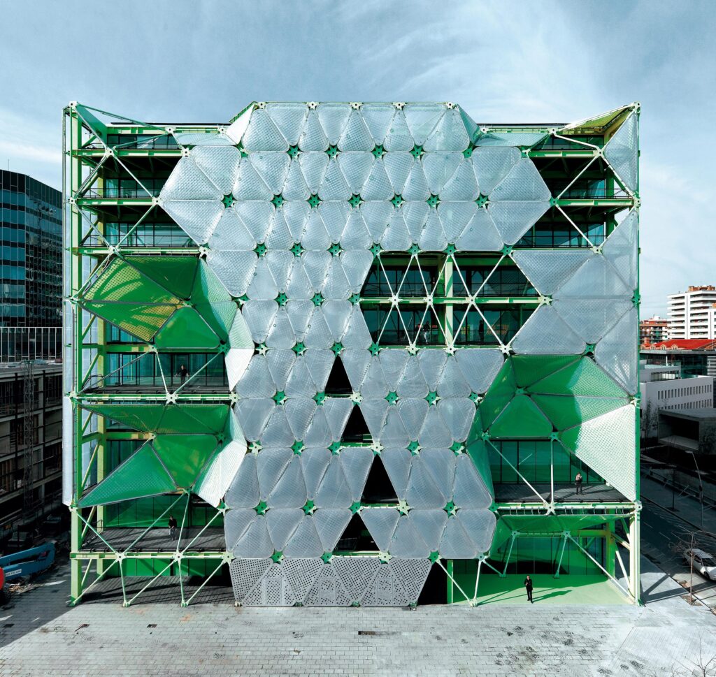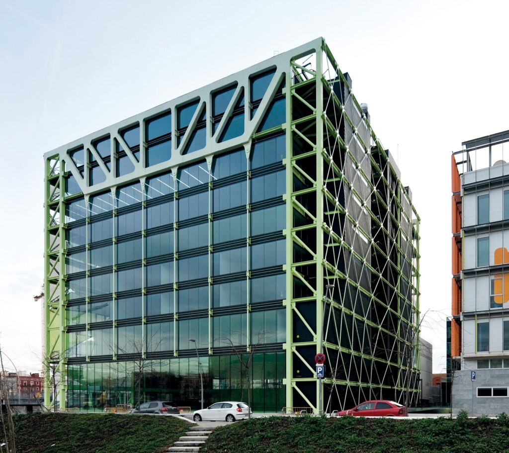 En este caso, se levantaron cuatro pórticos metálicos a los que se anclaron los tirantes encargados de sostener la plantas del Media-TIC. Una vez dentro, la impresión es de amplitud y cierto aire futurista que se complementa con un exterior estéticamente muy singular, gracias a su color verde y a su piel de EFTE con tres cámaras de aire y una superficie antiadherente que facilita el mantenimiento y controla el soleamiento. Pero nosotros nos quedamos con la fachada nordeste, en donde ser aprecia perfectamente el sistema constructivo y con las dos plantas inferiores, completamente libres de cualquier apoyo o elemento estructural.