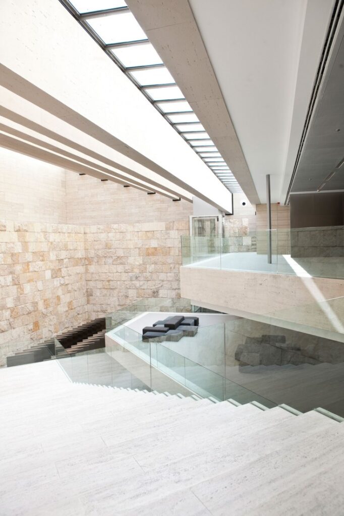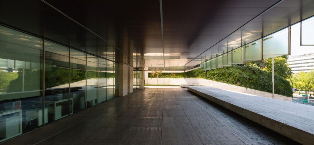 Y seguía: “Quedaba un problema: un edificio de cristal en una ciudad soleada es un horno o, más bien, un invernadero. Imaginen un coche con las ventanas cerradas, dentro hace un calor tremendo, pero al otro lado del coche, la luz filtrada ya no calienta. Con esa idea, mi padre atrapó el calor del sol en una doble piel de cristal que sólo dejaba pasar al interior la luz fría. Si quería ser consecuente sólo podía usar vidrio para sujetarlo… ¿Pilares de cristal? Parece una contradicción de términos, pero es lo que consiguió el arquitecto tras años de investigación. Aún hoy, este vidrio con función estructural es una excentricidad, una hazaña de ingeniería”. Una excentricidad sublime, añadimos nosotros. Una obra de arte atemporal, valiente y, afortunadamente, conservada tal cual la diseñaron sus arquitectos.