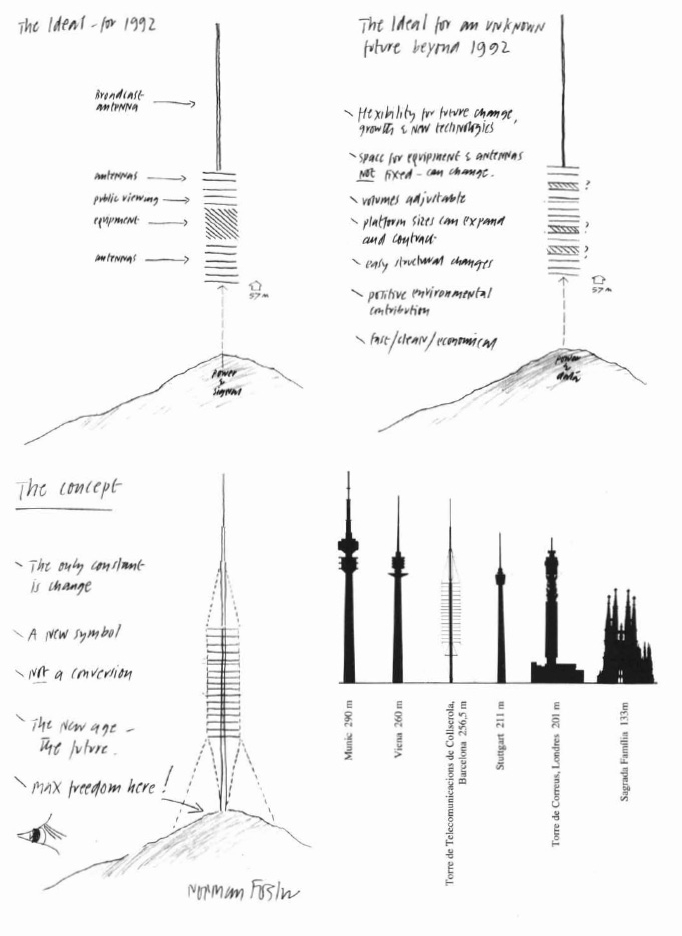 Corría 1988 y Barcelona se preparaba para ser sede olímpica en 1992. Entre los muchos requerimientos que comporta celebrar unas olimpiadas, uno de los principales consiste en hacer llegar los juegos olímpicos al resto del mundo. Para conseguirlo, había dos opciones: destrozar el perfil del Tibidabo con un bosque de antenas, o coordinar a todos los medios interesados y construir una única torre de comunicaciones que, además, fuera un icono tecnológico para la ciudad. El ayuntamiento lo tuvo claro y fue Norman Foster, de la mano de Televisión Española, TV3 y Telefónica, el encargado de conseguirlo. Y lo consiguió.