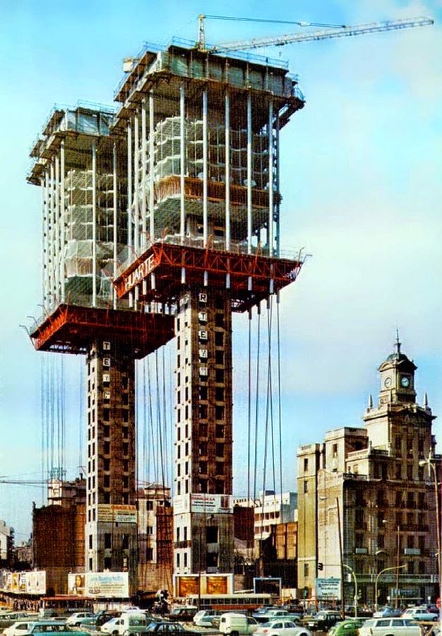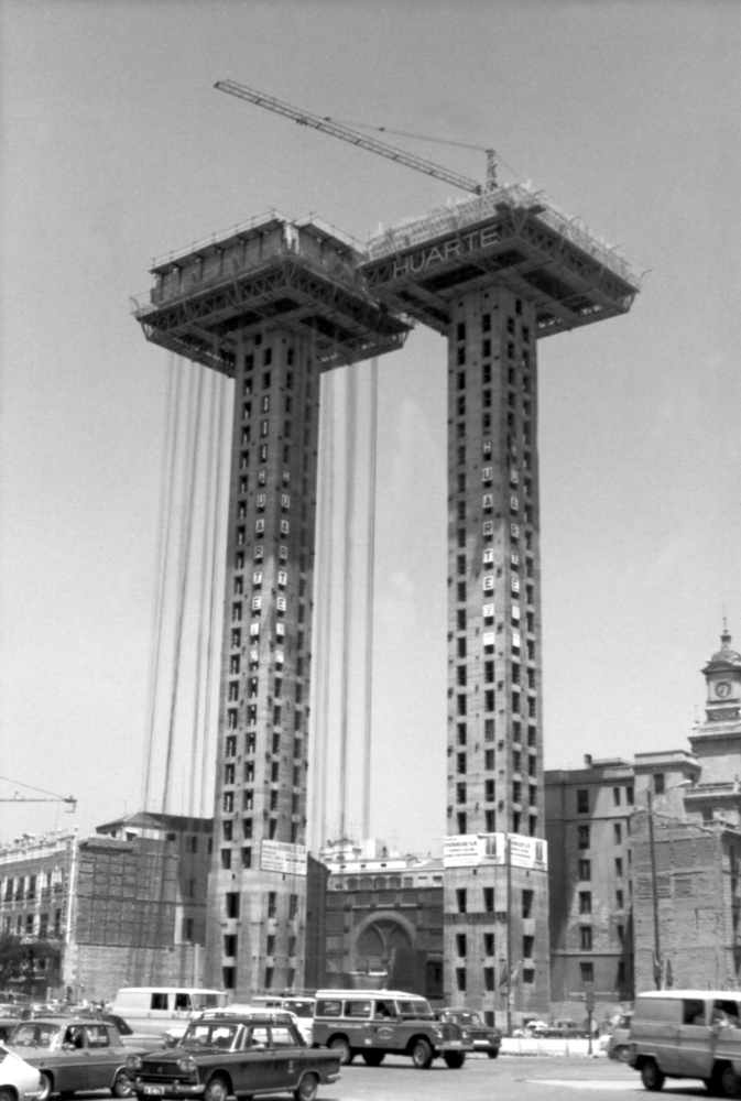 Finalmente, se demostró que la obra cumplía la normativa, ya que las tres plantas de altura extra que alegaba el ayuntamiento correspondían a las cabezas y no a superficie habitable. Pero, entretanto, los dos núcleos permanecieron desnudos, para estupor de los madrileños, incapaces de atisbar por dónde iba a ir ese proyecto tan extraño con dos torres raquíticas de hormigón. Tampoco es que el asombro terminase cuando, tras tres años de pleitos, la obra se retomó y vieron cómo los pisos se iban construyendo en sentido inverso al de cualquier edificio convencional. Nada más terminarlo, Osinalde se lo vendió al entonces empresario de moda: nada más y nada menos que José María Ruíz Mateos, todavía sin disfraz de Superman.