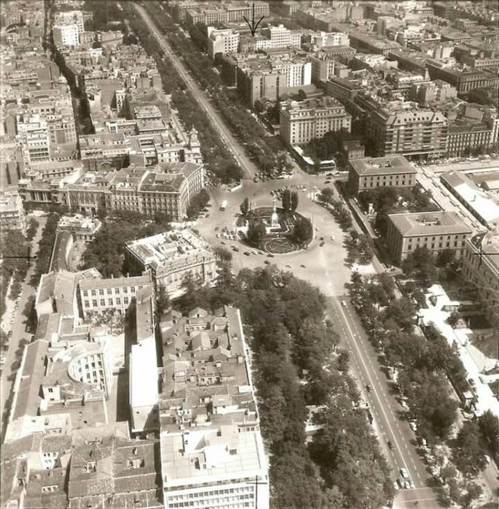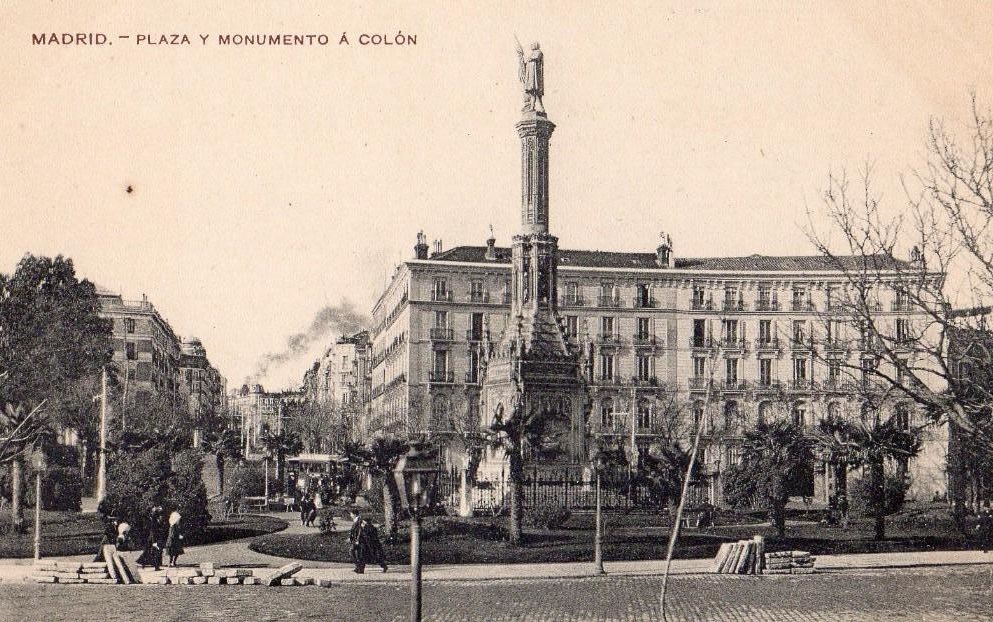 Muy distinto era el panorama a principios de los 60, con la vetusta Casa de la Moneda ocupando el espacio que hoy es la plaza y el palacio afrancesado del Duque de Uceda, rodeado de sus jardines, en lugar de la mole del Centro Colón. Y justo en la esquina de enfrente, en el solar de las futuras torres, la casa-palacio de Don Luis de Silva y Fernández de Córdoba, donde también vivió el escritor Benito Pérez Galdós. Todo muy decimonónico y, las cosas como son, muy homogéneo y bastante coherente en su conjunto.