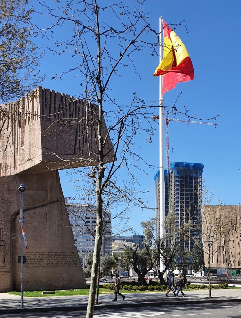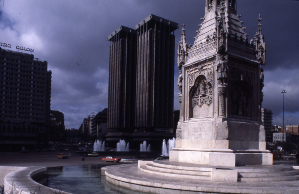 La plaza de Colón que conocemos hoy no tiene nada que ver con la que existía solo unos años antes de comenzar la construcción de las torres. De la actual se ha dicho que es un conjunto deslavazado de elementos inconexos, una suerte de totum revolutum donde cabe un conjunto escultórico brutalista, el edificio neoclásico de la Biblioteca Nacional, la estatua neogótica de colón, una bandera de España de proporciones colosales, una escultura temporal de Plensa que ya es casi indefinida… Y las Torres, claro. Como referencia constante, dominando el puzle.