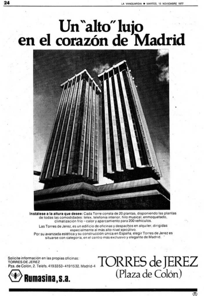 Si Ruiz Mateos compró un edificio de oficinas, fue gracias a la paralización de las obras. El proyecto, en sus inicios nació como residencial de lujo –“alto standing” para los snobs de la época-, pero, después de la aventura judicial, se obtuvo como contraprestación un cambio de uso. Con ello, no solo se consiguió un beneficio mucho mayor, sino también la posibilidad de instalar una fachada vertical, sin terrazas que interrumpieran y restasen protagonismo a los elementos estructurales.